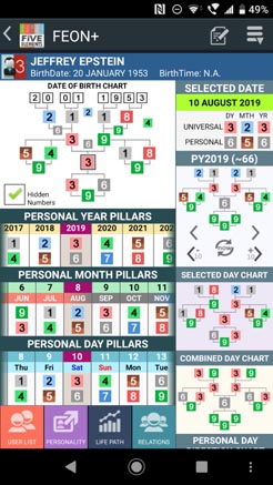 Let’s look at Jeffrey Epstein’s EON Chart. At a glance, Epstein has some form of Double-Effect impact on the numbers in M-N-O-P-Q-R of his Birth Chart, almost similar to the same location on the fatal Day chart (10 August 2019). In addition, there is another set of Double-Effect impact found – the Personal Year (PY2019) and the Combined Day Chart – the 3-3-6-9-9-9 pattern is present on both charts. The common signs between both Double-Effects is the 3-6-9 patterns.