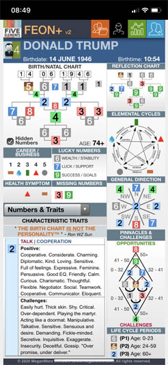 Here’s another way to interpret the 2-2-4-6-6-3 pattern in locations M-R of his birth chart, as [Express – Communicative dialogue – About his plans – To stabilise – USA economy – By concentrating on immediate action]. That sounds reasonable, doesn’t it? Well, there’re always two extreme ends to a left-right, positive-negative, or yes-no; and depending on which side of the coin you’re looking at. We could also read it as [Talk – Repeat talking – Conveying his plans – Boasting about abilities to boost Economy and Financials – More for Self-Pride and Ego – By making critical and hurtful remarks]. Ouch! In any case, I could sense the frustrations from many people when we talked about Donald Trump’s behaviours. You can easily look at the “Numbers & Traits” options to interpret the 2-2-4-6-6-3 patterns, like putting in random words in a jackpot-like connection.