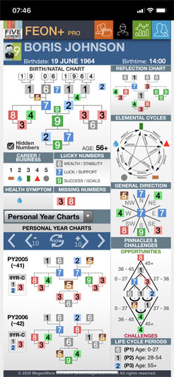 Look at Boris Johnson’s EON chart. He has an affair in 2005, and the double 7-7 pattern is shown on his PY2005 chart. This means an extra overfilled of sensuous water pouring in. This “overflow” effect could have produced the increasing gratifying feelings and tryst desire. Furthermore, the 3-3 pattern is manifesting as well. When there are too many 3s present in the PY chart, it could potentially lead to higher sexual activities. The 9-Year Cycle (9YR-C)code for PY2005 is showing 1-2/3. Once more, the extra sensuous 2 and sexual 3 vibes comes into action, influencing his thinking, feelings, and behaviours.