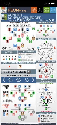 Look at the screenshot showing Arnold Schwarzenegger’s EON chart. He has the number 5 indicated as “missing number.” His PY2020 Chart is showing the Root number 5, which technically, should enhance his wellness related to number 5, the Earth element. From the Five Elements principles, Fire “support or produce” Earth, and in turn, strong Earth element could weaken or exhaust the Fire element. We could associate the Fire element with the heart and blood vessels.