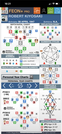 When you’ve the 5-7-3 (or 7-5-3) pattern present in your Birth chart, it doesn’t imply you’ll become a bankruptcy at least once in your lifetime. The result of your becoming bankrupt, is a mentality attitude, which has influenced how you want to cope with the situation to move forward. Many people would negotiate with their banks for monthly repayments. Then there are wealthy people, like Robert Kiyosaki, who voluntarily went bankrupt under the law but still continue to enjoy a high lifestyle. Click here to check this article, titled “The Ultimate Hypocrite: Robert Kiyosaki and His Company’s Bankruptcy” for some insights. According to this separate article (click here), titled “’Rich Dad, Poor Dad’ Author Files for Bankruptcy for His Company,” it was quoted that Robert “filed for corporate bankruptcy through one of his companies” in 2012. A quick look at his Personal Year PY2012 chart shows the 7-5-3 patterns at locations V-N-L and V-N-M.