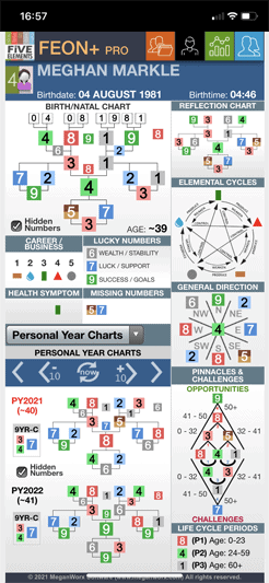 The left screenshot shows Meghan Markle‘s EON Chart, taken from a beta copy of FEON+ Pro running on an iPhone device. The numbers in locations M-N-O-P-Q-R of her Birth Chart is similar to the same locations in her Reflection Chart. As mentioned earlier, the tendency signs are suggesting Markle often speaks from her mind, directly and unhesitatingly whenever opportunities arise. And that could sometimes agitate and frustrated others, creating tensions unnecessary – the signs of 4-8-3 pattern in her Birth Chart, which coincidentally could be interpreted as relationship strains or communication problems with her father. This year, the 4-8-3 pattern appears in locations P-O-M of her Personal Year (PY) 2021 Chart. This implies, the tendency to impose more strained relationships with others, and creating unnecessary tensions and stress on others.