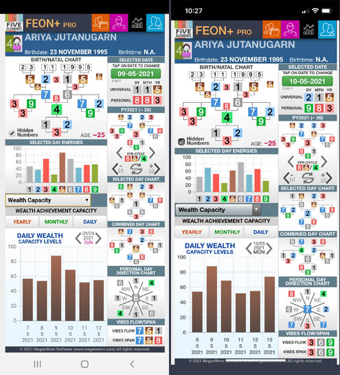 I am pleased that the current status provides visual clues of the individual’s financial capacity. No, this is not based on rudimentary associations with the number 6 only; it is so often a misleading assumption that many external trainers have associated it with money. For example, if you’ve the FEON+ Pro software and plotted Ariya’s chart, you’d noticed that the strength of the number 6 is much stronger on 10 May 2021 (right screenshot) than 9 May 2021 (left screenshot). So technically, the Wealth Capacity level for 10 May 2021 should be higher, but when you looked at the screenshots (scaled to fit the height of the devices) showing the Wealth Capacity, it’s much lower than 9 May 2021.